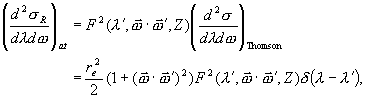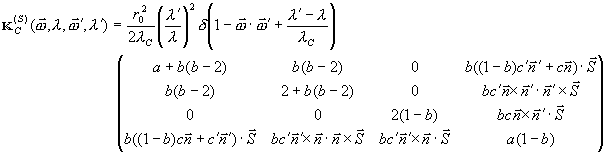 The above statement means that the scattering cross section determines the probability for a plane polarised photon to be scattered in a certain direction and then to pass through a hypothetical filter which accepts only radiation polarised in a certain plane. Elliptical polarisation is not considered by such a treatment. Therefore, for a complete analysis of the polarisation effects it is more convenient to use the Stokes' representation. Assuming that the effect of charge distribution (in many electron atoms) contributes a polarisation independent scattering function and the spin of the electron is randomly oriented before, and is not observed after the scattering (Fano et al., 1959), the matrix kernel for Compton scattering becomes: