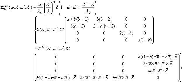 For studying the effects of non-linear polarisation on the scattering of x-rays in a target exposed to a magnetic field is useful to consider a more complete kernel including the magnetic terms omitted in equation (44). This matrix kernel can be obtained in a first approximation by considering Compton scattering by a free electron exposed to an external magnetic field, becomes (Fano, 1949):